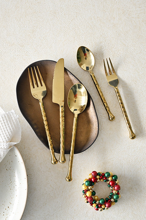 Honouring the preserved traditions of hand-forged metalwork in the ancient capital city, our Ayutthaya Collection brings luxury artisanal craft to the modern table. Each handle is twisted with smoothly textured pound-marks and a teardrop end, providing a beautiful balance to each piece. Polished to a timeless shine for the most elegant of table settings. Available in Polished Gold, Polished Steel and Matte Black with polished ends.