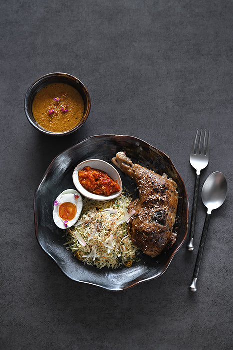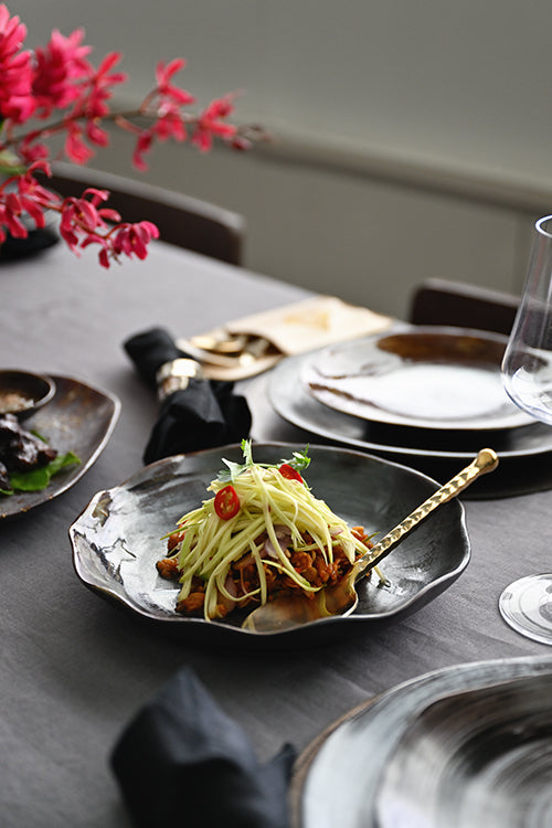 Swirling smoke filling the air, kissing the wok, and alighting your senses. The Wok Hei collection features a dark, smoky charcoal base with a gentle swirling brushstroke in a textured semi-gloss.