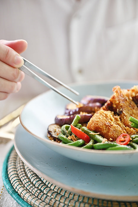 Inspired by vast cloudless skies, Sii Faa, meaning 'sky blue' in Thai, is a matte, light blue glaze with a constellation of speckles and an exposed rim. A popular pastel hue for fresh dinner or brunch settings.