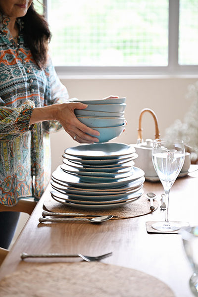Inspired by vast cloudless skies, Sii Faa, meaning 'sky blue' in Thai, is a matte, light blue glaze with a constellation of speckles and an exposed rim. A popular pastel hue for fresh dinner or brunch settings.